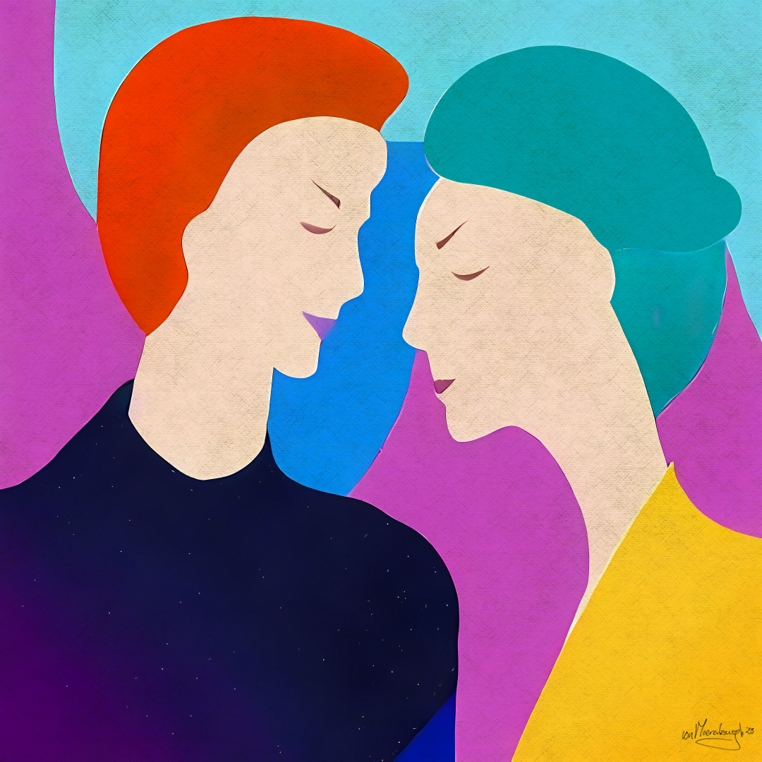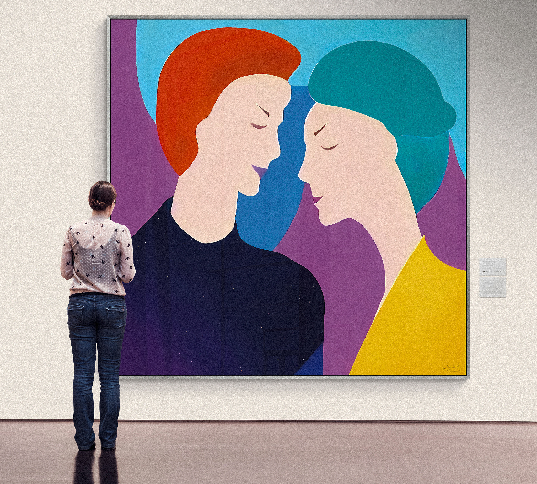 In “M,” vonMoerenburgh orchestrates a duet of faces, weaving together a symphony of color and form. The visual dialogue invites viewers to contemplate the interplay of hues, celebrating the harmony and connection expressed through the simplicity of clear shapes and bold colors.